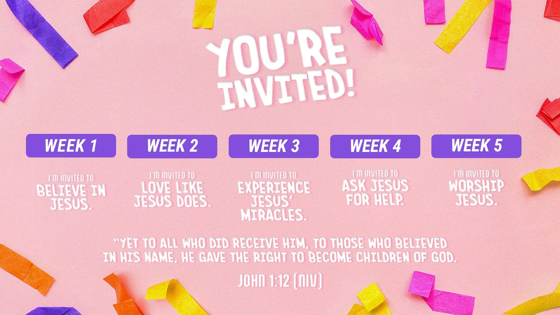 SERIES OVERVIEW: Getting invited to a party is one of the best feelings, and being left out is one of the worst. But there's good news—Jesus never leaves anyone out! He invites everyone to spend time with him, experience his love, and share it with others. This series will remind kids that Jesus' invitation is always open, and we're never too far away to join the party! In this 5-week series, kids will learn that I'm invited to believe in Jesus, love like Jesus does, experience Jesus' miracles, ask Jesus for help, and worship Jesus.